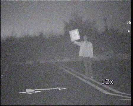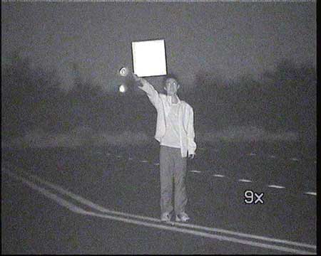 同时, 我们对该机的红曝点表现也进行了观察。 当人体在30米距离内正面面对摄像机时, 我们能够清晰地看到红曝点呈现排列的圆状; 当人体距离摄像机60米开外时, 我们只隐约能看到几个红点, 可见该机在夜间的工作隐蔽性是很强的。经过实际测试后我们得出, 该款摄像机红外实测距离约为160m, 标准100m、 人脸识别能力60m, 同时在较近的地方不会出现红外曝光的现象。